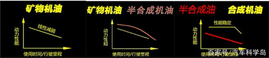 假设这三种机油都是【0W-40的标准】,应该选择哪种等级的机油呢?大部分人认为级别越高的机油润滑能力越强,然而这是个错误的理解;只要参数相同那么润滑能力就是相对一致的,三种机油的主要差异是耐用性的区别,参考下图的性能衰减曲线。