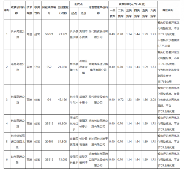 近日,湖南针对货车高速收费标准重新制定了二、三、四、五、六型货车的收费标准。5月3日,湖南省交通运输厅公开最新收费标准。