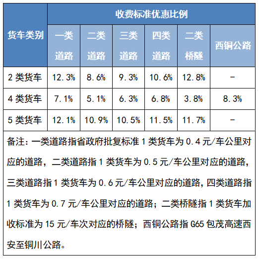 全省高速公路货车实施差异化收费。经省政府批准,合法装载的2、4、5类货车,通行陕西省四类高速道路及第二类加收的桥隧,4类货车通行G65包茂高速西安至铜川公路时,在陕政函〔2019〕207号文件批准收费标准优惠10%的基础上再次进行优惠,具体优惠比例如下。