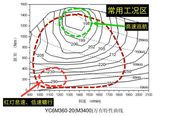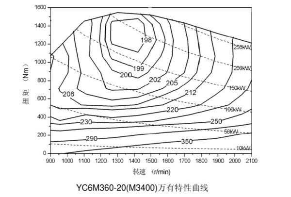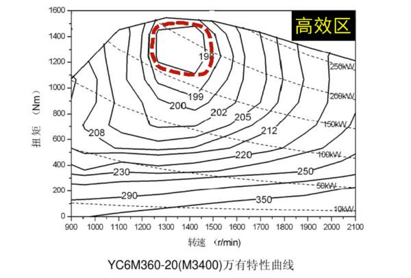 从上图来看,在这台玉柴发动机的经济转速区间约为1250-1500转,扭矩接近峰值水平,而此时的功率输出为270马力,达到YC6M360-20发动机功率输出的80%,基本满足大部分工况的动力需求。