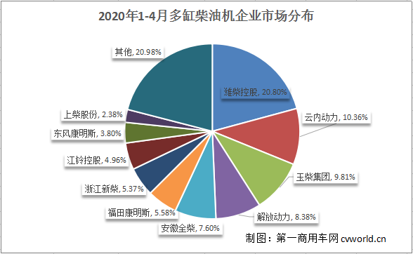 二是福田康明斯回升第六。福田康明斯在多缸柴油机领域,排行基本是在第六或第七位,3月短暂降至第七位后,在4月份立即回升至第六,不仅如此,其份额也实现了增长,由1-3月份的5.24%提升至5.58%,净增了0.34个百分点。