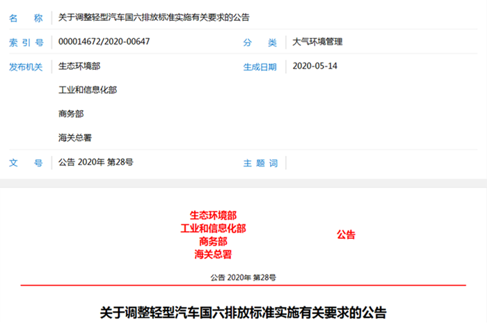 5月14日,生态环境部等四部门发布《关于调整轻型汽车国六排放标准实施有关要求的公告》。自2020年7月1日起,全国范围实施轻型汽车国六排放标准,禁止生产国五排放标准轻型汽车,进口轻型汽车应符合国六排放标准。