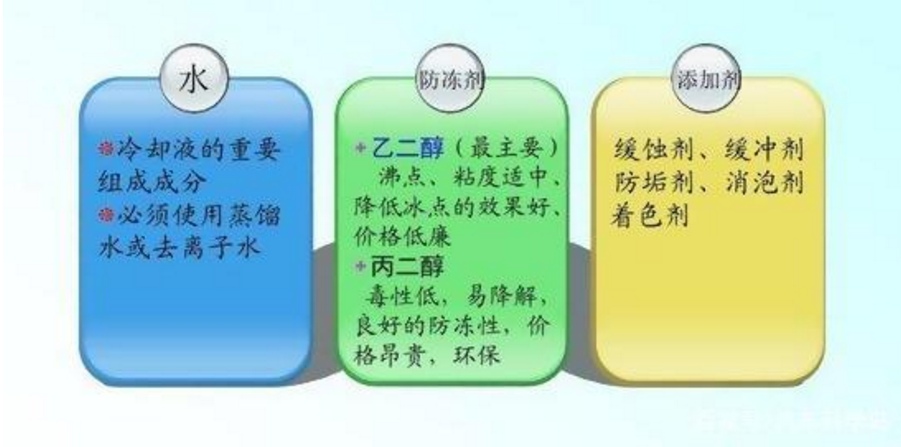 燃油动力汽车装备的内燃式热机需要水冷系统,指利用防冻冷却液(下文简称防冻液)在缸盖管路中循环流动,在流动过程中吸收热能并升温;达到前置散热水箱后进行散热降温,随即再循环到缸盖吸热。在启动发动机后防冻液就会周而复始的循环,这种水溶液如果具备腐蚀性的话,相信这种内燃机真就用不了几天了——防冻冷却液必然是防腐蚀的!