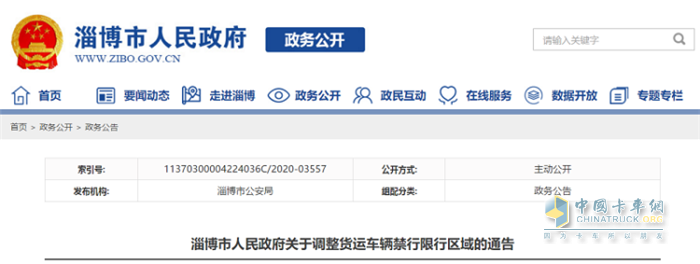 2020年6月2日,山东省淄博市人民政府发布《关于调整货运车辆禁行限行区域的通告》,对货运车辆禁行限行区域进行了调整,分别对中重型货车、轻型货车、低速货车、专项作业车等划定了限行区域和时间。