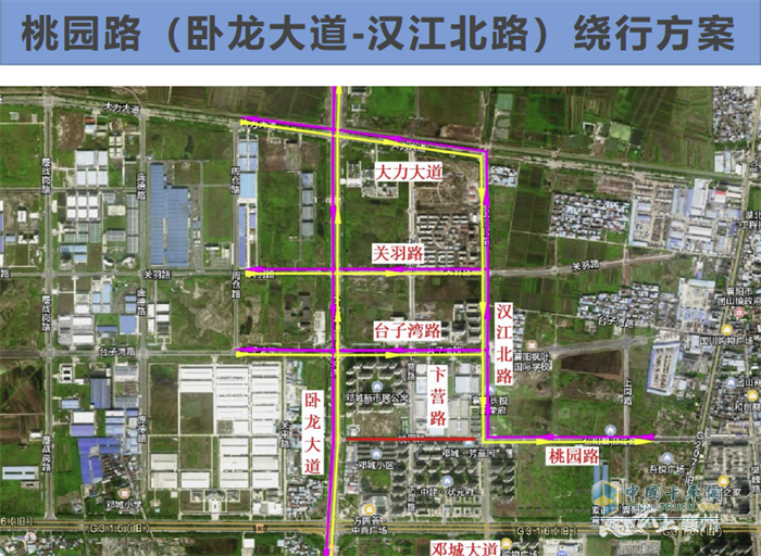 桃园路(卧龙大道-汉江北路)禁止货车通行后,欲通行该路段的货车可选择绕行:大力大道、关羽路或者台子湾路等路段。(如图中粉红色及黄色线所示)