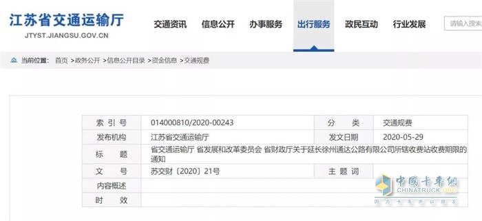 江苏省交通厅、江苏省发展和改革委员会、江苏省财政厅近日联合发布文件《关于延长徐州通达公路有限公司所辖收费站收费期限的通知》,将徐州通达公路有限公司所辖的322省道郑集收费站、311国道大彭收费站、310国道夹河收费站、323省道徐庄收费站的收费截止时间由2020年5月31日24时延长至2020年8月18日24时。