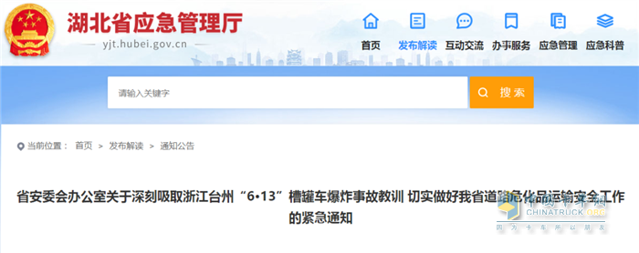 为深刻吸取浙江台州“6·13”槽罐车爆炸事故教训,举一反三,认真做好湖北省道路危化品运输安全工作,现就有关要求紧急通知如下:
