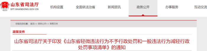 近日,山东省司法厅印发通知,发布《山东省轻微违法行为不予行政处罚和一般违法行为减轻行政处罚事项清单》。
