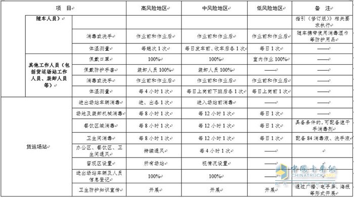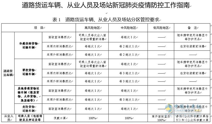 各地交通运输主管部门要组织开展广泛宣传,督促指导道路货运企业和货运场站经营者严格按照《指南》表1的要求,全面做好货运车辆、场站消毒及从业人员防护等工作。冷藏保鲜货物运输车辆进出中高风险区域的,经营者参照《指南》表2要求进行信息登记。遇有突发情况立即按照有关规定程序报告属地疫情防控工作机制或有关部门。