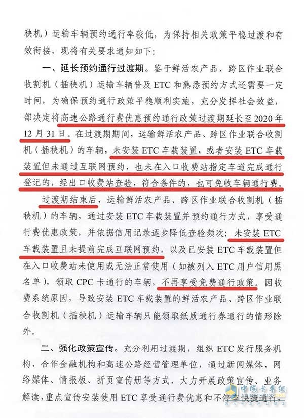 过渡期期间,运输鲜活农产品、跨区作业联合收割机(插秧机)的车辆,未安装ETC车载装置,或安装ETC车载装置但未通过互联网预约,也未在入口收费站指定车道完成通行登记的,经出口收费站查验,符合条件的,也可免收车辆通行费。