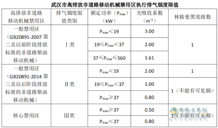 市人民政府于2019年10月26日发布了《关于划定武汉市高排放非道路移动机械禁止使用区的通告》,将武汉市建成区范围以内区域划为核心禁用区,严禁超过《非道路柴油移动机械排气烟度限值及测量方法》(GB36886-2018)Ⅲ类排气烟度限值标准的高排放非道路移动机械在核心禁用区内使用;将核心禁用区以外的全市其他行政区域划为一般禁用区范围,严禁超过《非道路柴油移动机械排气烟度限值及测量方法》(GB36886-2018)规定排气烟度限值的高排放非道路移动机械在一般禁用区内使用。