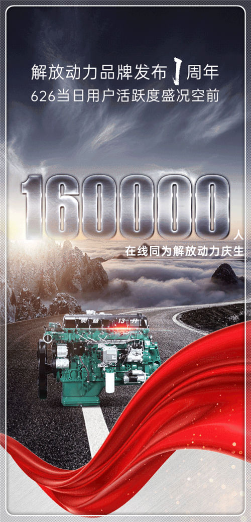 解放动力品牌发布1周年,2020年6月26日用户活跃度盛况空前,16万人在线同为解放动力庆生。