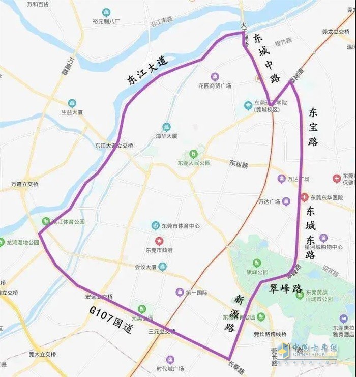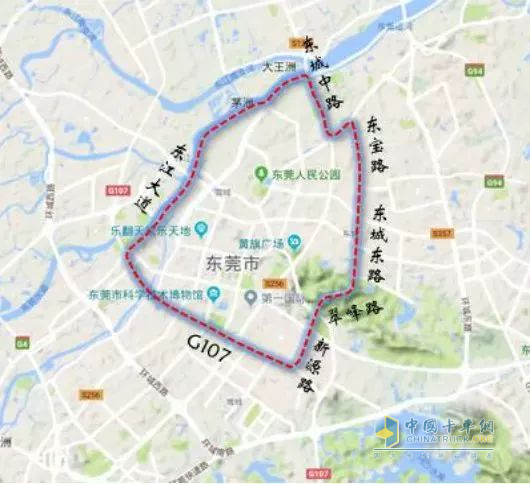 1.东宝路一东城东路一翠峰路一新源路一G107国道一东江大道一东城中路一莞龙路一东宝路连接范围以内(不含上述边界道路),每天7:00-9:00、16:00-20:00禁止载货汽车通行。