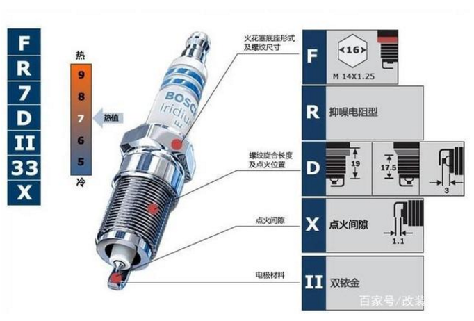 火花塞的热值,这个数值是由小写的阿拉伯数字标识的,简单理解就是火花塞裙体(包裹中心电极的部位)的温度的高低,但是由于品牌不同这个热值数字并不是统一的,而且不同品牌数字的升高或者降低也不是一定表示热度增高还是降低,这点很烦。所以,我们需要知道的是,火花塞所能够承受的耐热度量是不同的,所以说如果我们要将自己的火花塞的热度值提升,也就是更换更高度数的火花塞。这样的话就能够提高更大的耐热性,在这种情况下就能够爆发出更多的热量,也就能够使汽车的性能再提高一大部分。目前,正常来说,原厂使用的火花塞一般热度值都会选择一个比较适中的数值,比如7。所以,我之前说到的,改装过的车子由于发动机的性能输出的提高,发动机工作强度温度都会随之提高,所以,一般我们都会推荐在原火花塞寿命将近的时候,更换热度更高的火花塞,对于发动机有更好的工作性能提升。但是,也并不是越大越好,比如原厂使用的是热度6的火花塞,一般我们都会结合实际硬件和马力情况,来推荐升级同品牌的热度值7、8、9的火花塞,不要跳跃过大,直接使用热度值10的,而且强调的是跟原厂配套代工同品牌的,因为不同品牌的热度值往往表示的热度值并不统一。当然有些改装品牌的火花塞配套已经是针对车子做了反复测试的,这些则需要考虑的就非常少了,直接更换即可。再简单一点来说,改装车由于对于发动机高转速工作强度要求比较高,所以,选择散热好的火花塞,在热值上来说选择比原厂高一些的产品,需要注意的是,冠军和博世火花塞的表示方法是数字越小热值越高,NGK和电装的表示方法是数字越大热值越高。