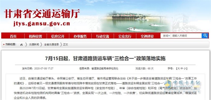近日,由甘肃省交通运输厅牵头,会同省公安厅、省生态环境厅、省市场监管局联合出台《关于进一步推进全省道路货运车辆“三检合一”改革工作的通知》,这标志着又一项交通便民服务举措与物流降本增效实招在甘肃正式落地——道路货运车辆全面实现“三检合一”。
