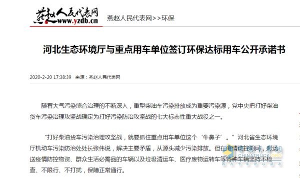 日前,河北生态环境厅与重点用车单位签订环保达标用车公开承诺书,加强对重型柴油车的相关治理。承诺书包括:进出单位的所有重型柴油车、重型燃气车达到国五及以上排放标准,不签订承诺书的将会受到严厉处罚。