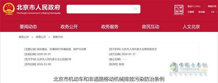 2020年3月9日,《北京市机动车和非道路移动机械排放污染防治条例》(以下简称《条例》)正式公布。《条例》表示:自今年5月1日起,京津冀三省市将协同防治大气污染,重点整治机动车尤其是重型柴油车排放不达标的问题。
