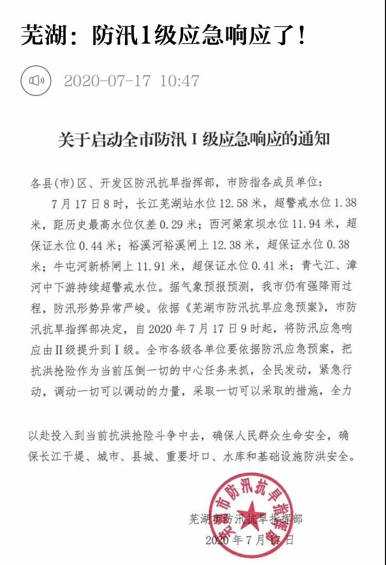 受长江上游来水和连续强降雨影响,芜湖市河流、水库水位持续上涨,长江芜湖段、大小河流、支流超警戒水位。根据《芜湖市防汛抗旱应急预案》,市防汛抗旱指挥部决定,自2020年7月17日9时起,将防汛应急响应由Ⅱ级提升到Ⅰ级,防汛抢险任务十分艰巨!