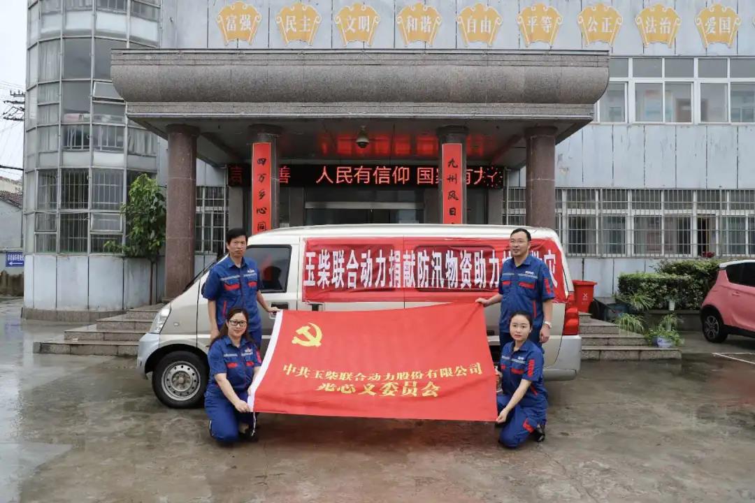 ▲联合动力党总支部副书记陈贻云(左二)带队捐赠防汛物资