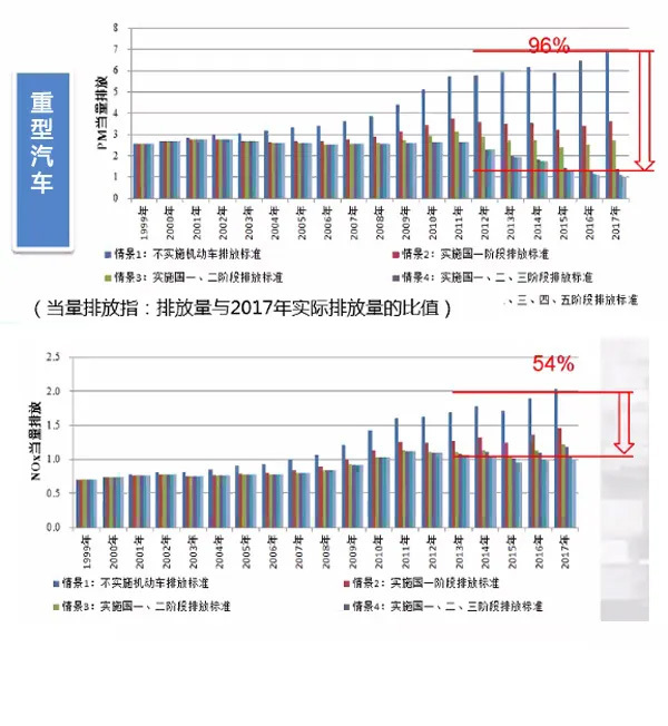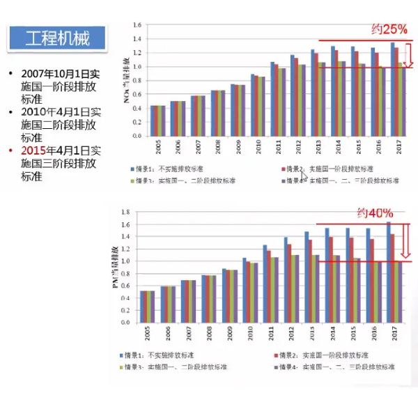 如重型汽车PM当量排放相比标准实施前减少约96%,NOx当量排放相比标准实施前减少约54%;工程机械PM当量排放相比标准实施前减少约40%,NOx当量排放相比标准实施前减少约25%。