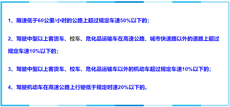 另外,根据公安部交管局出台《关于规范查处机动车违反限速规定交通违法行为的指导意见》:以下几种轻微交通违法行为,未造成后果的,由公安交通管理部门予以警告,不再扣分罚款。