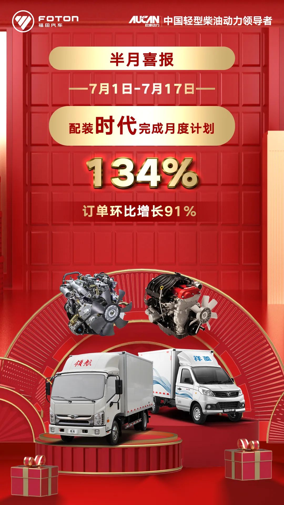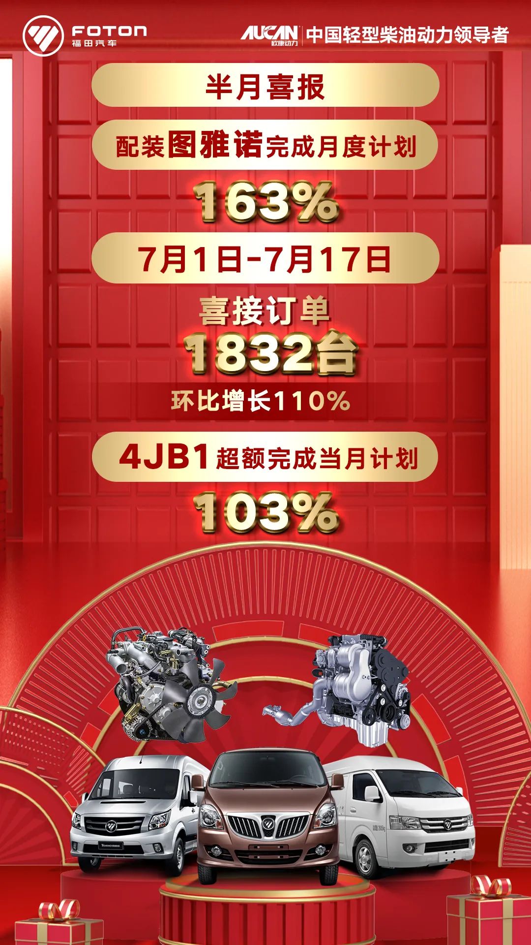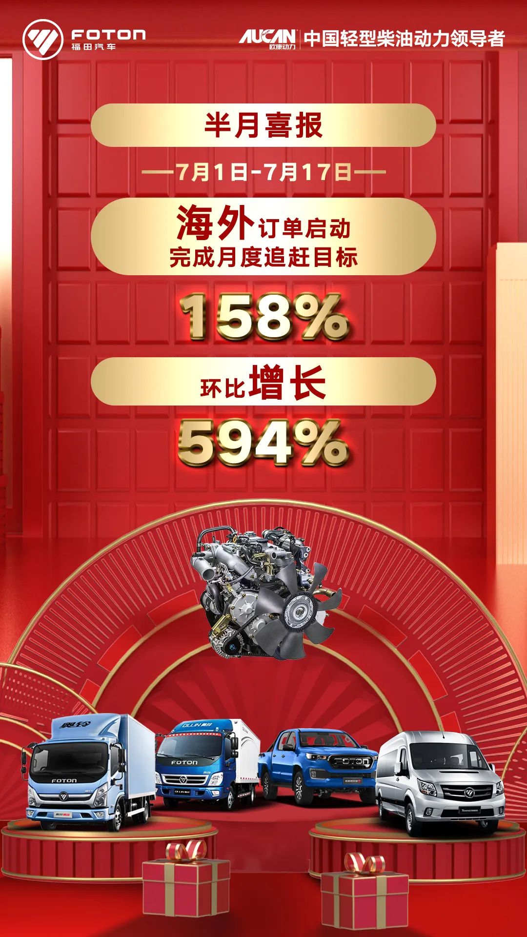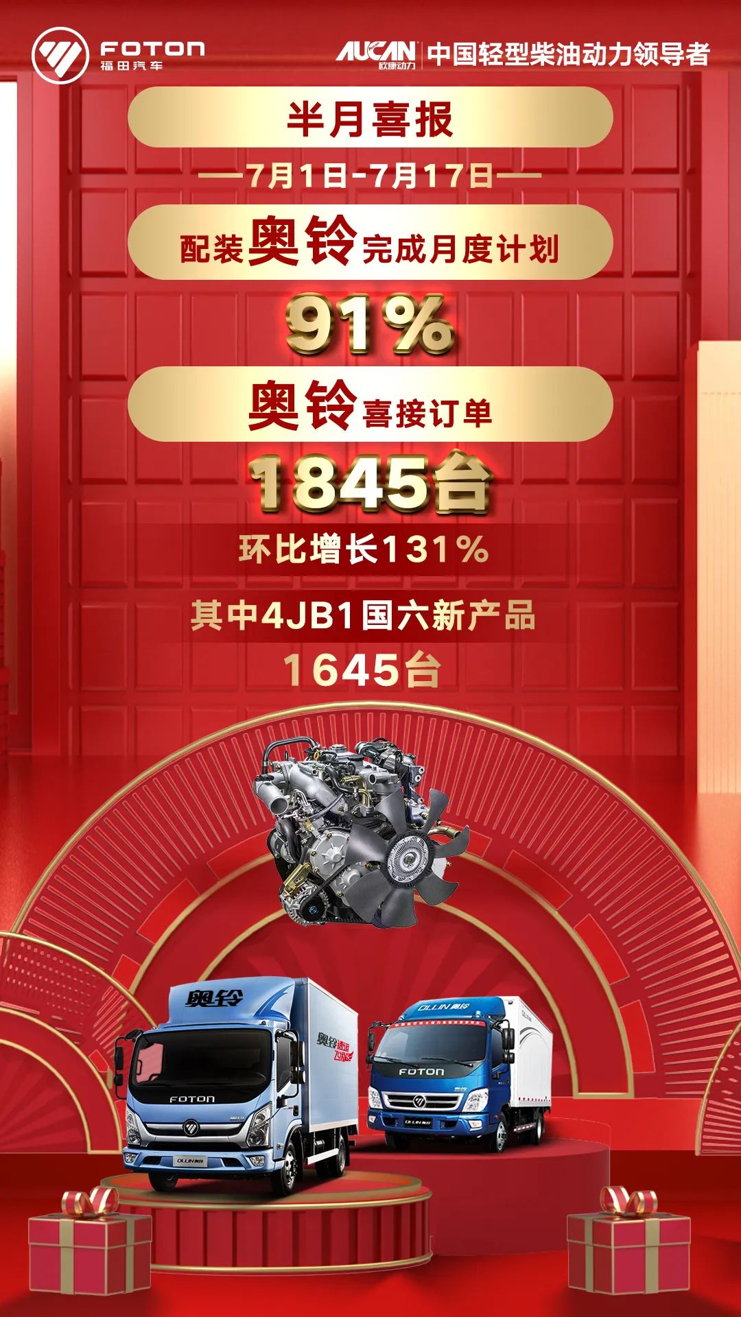 进入7月份,福田汽车发动机事业部营销借复工复产的东风,在上半年疫情后加速反转的态势下,联合整车客户出政策、做推广,销量加速度明显,各产品多点开花,态势喜人!