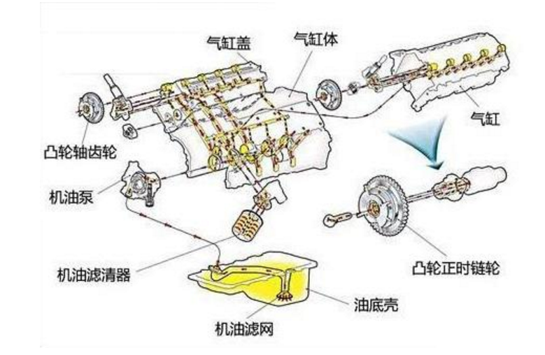 内燃式热机形成有效润滑的效率其实是很高的,因为机油贮存的位置是发动机最低位置的曲轴箱(油底壳),启动后是利用机油泵从低位抽油并快速送到发动机各个位置。