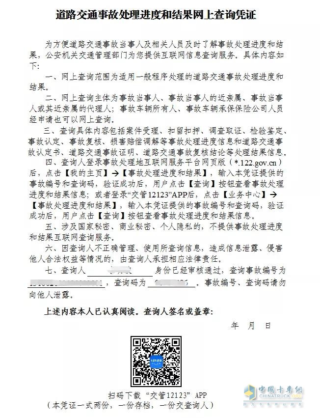 查询主体可以通过登录 “交管12123”APP或者互联网平台网页版(*.122.gov.cn),输入查询凭证提供的事故编号和查询码进行查询。