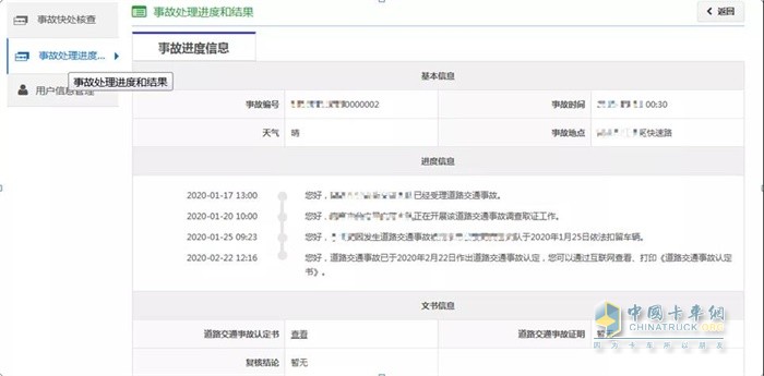 用户登录互联网平台网页版(*.122.gov.cn)后,进入【我的主页】,点击【事故处理进度和结果】,输入正确的事故编号和查询码,即可查询事故处理进度和结果。