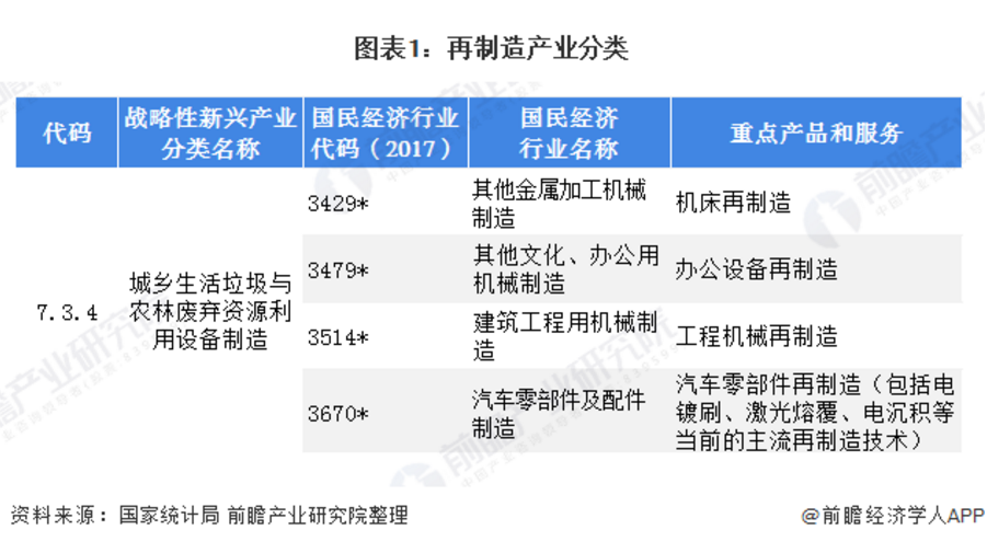 再制造产业是以产品全寿命周期理论为指导,以实现废旧产品性能提升为目标,在原有产业的基础上,利用技术手段将废旧产品进行修复和改造的一种产业。再制造产品与新品相比可以节约成本50%,节能60%,节材70%。当前,我国再制造产业仍处于起步探索阶段。2018年11月,国家统计局发布了《战略性新兴产业分类(2018)》,再制造产业在战略性新兴产业-城乡生活垃圾与农林废弃资源利用设备制造中的再制造重点产品包括机床再制造、办公设备再制造、工程机械再制造和汽车零部件再制造等。