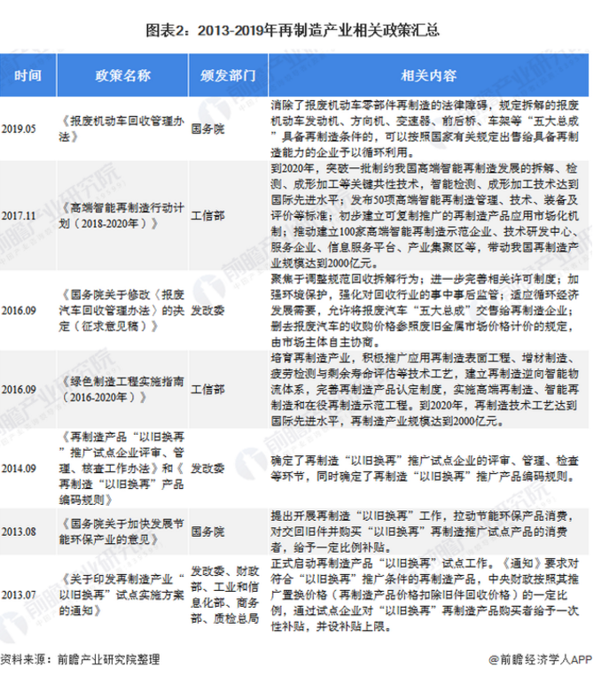 由于建设资源节约型和环境友好型社会,顺应资源日益稀缺等环节要求,再制造产业由于其节能环保等特点受到国家一系列政策法规的大力支持。2019年5月,《报废机动车回收管理办法》消除了报废机动车零部件再制造的法律障碍,规定拆解的报废机动车发动机、方向机、变速器、前后桥、车架等“五大总成”具备再制造条件的,可以按照国家有关规定出售给具备再制造能力的企业予以循环利用。