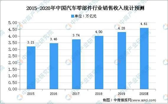 近年来,中国汽车零部件行业市场规模的发展速度趋于稳定。根据中国汽车工业协会统计数据显示,2018年,我国汽车零部件制造企业实现销售收入4.00万亿元,同比增长7%。在汽车行业平稳增长的带动下,零部件市场发展总体情况趋于良好。预计2020年中国汽车零部件行业销售收入将达4.61万亿元。