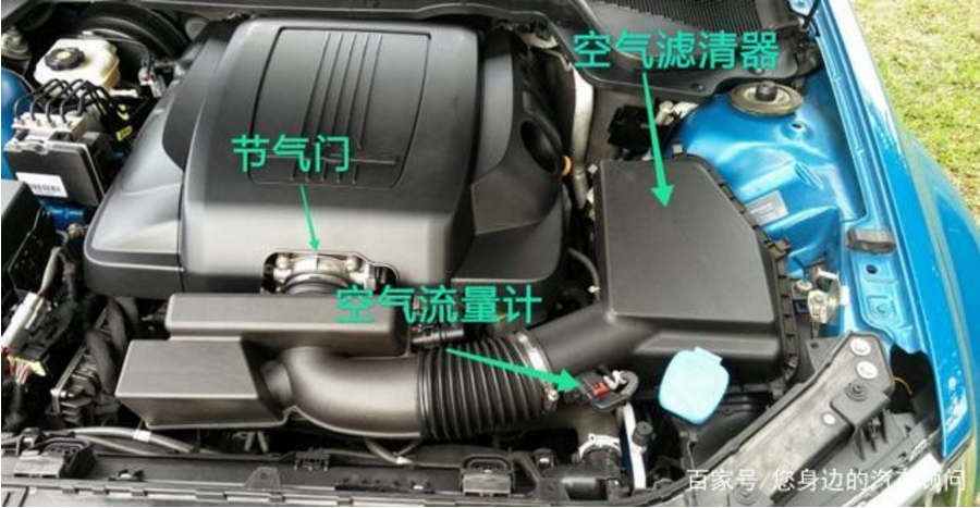 这个图就可以很直观地看出来其结构,发动机工作时空气被空滤过滤后先经过空气流量计,空气流量计会计算出进气量。然后气流经过节气门,在这里能通过多少气完全由节气门说了算,节气门开度大点通过的空气就多点,节气门开度小一点通过的空气就少一点。