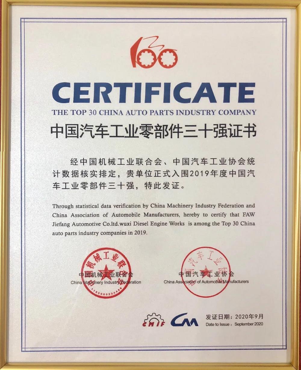 日前,在第十六届“中国机械工业百强、汽车工业整车二十强、零部件三十强企业信息发布会”上,解放动力事业部成功入围“2019年度中国汽车工业零部件三十强”。