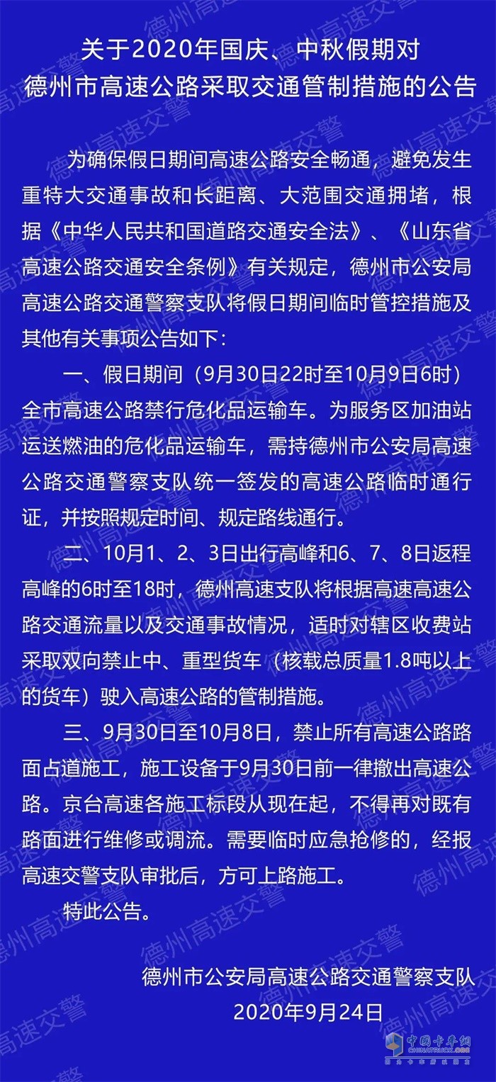 日前,德州高速交警发布国庆、中秋假日德州高速交通管制通知,事关货车通行,请货车驾驶员仔细阅读。
