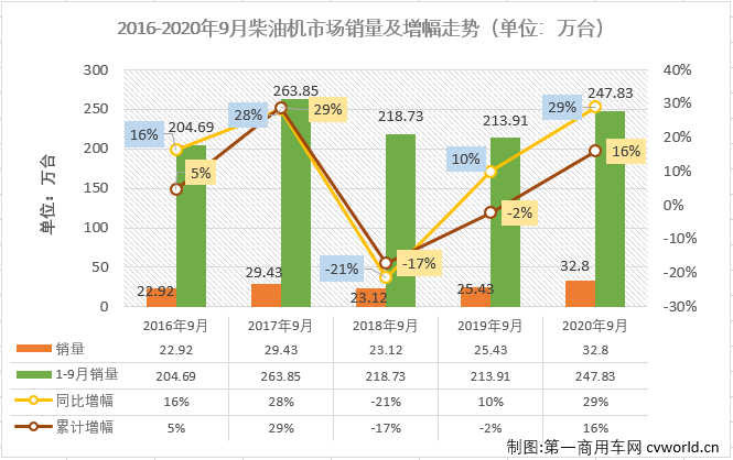 进入2020年,9月份32.8万台的销量是近5年表现最优秀的9月份,也是近5年柴油机市场唯一一次销量超过30万台的9月份,比上一个峰值的2017年9月份还多卖3.37万台。经过最近6个月的连续增长,今年柴油机市场的累计销量已站到了近5年第二高位的位置,比去年同期多销售近34万台,但仍与最高位的2017年有16万台的差距。