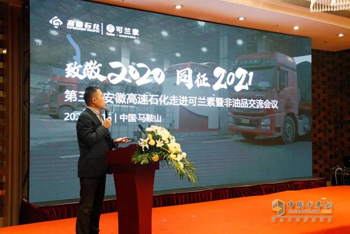 随后,秦总针对国六政策的全面实施以及今年重卡销售市场现状进行了分析。秦总表示,在新的经济发展基调下,刺激国内消费已成必然。而消费需求升级意味着物流业发展提速,重卡的需求量也会激增。因此,在国六落地、内循环扩大的双政策背景下,留给可兰素的是一个具有非常广阔前景的市场。2021年,可兰素将会持续强化渠道及产品建设,不断提升对安徽高速石化的服务水平,在配送、促销、培训方面,追求更高效率,协助安徽高速石化再创佳绩。