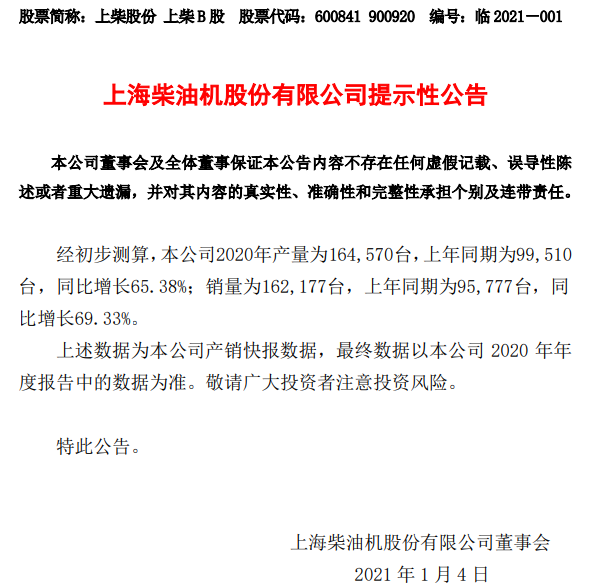 1月4日,上柴股份发布提示性公告,经初步测算,公司2020年产量为164,570台,上年同期为99,510台,同比增长65.38%;销量为162,177台,上年同期为95,777台,同比增长69.33%。