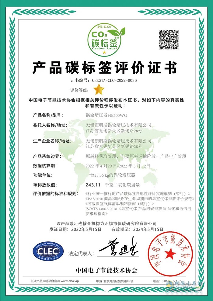 无锡康明斯涡轮增压技术有限公司本次获评正是源于公司一直以来对产品的创新设计以及对制造的环保节能追求。在发动机零部件中,涡轮增压器属于环保型产品,充分利用了发动机排出的废气,驱动空气进入并被压缩,从而提升燃烧效率、减少废气排放。“碳标签”证书进一步量化了产品生命周期中的温室气体排放,通过数据核算,建立上下游产业链的绿色产品机制,在推动上游供应商采购绿色原材料产品的同时,又获得了下游客户的认可和信赖,助力更多低碳环保产品走向市场。