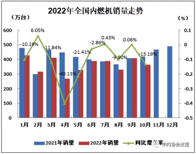 2022年10月内燃机行业销量环比、同比均下降,累计降幅较上月略有扩大。
