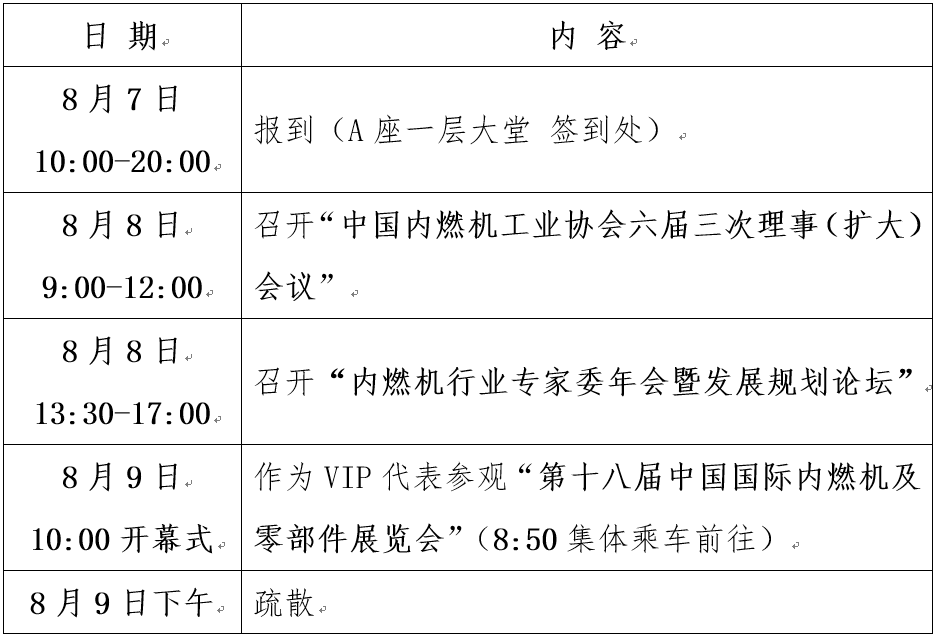 经研究决定,我会定于2019年8月8-9日在北京召开“中国内燃机工业协会六届三次理事(扩大)会议”,届时请您出席会议。现将会议具体事项通知如下: