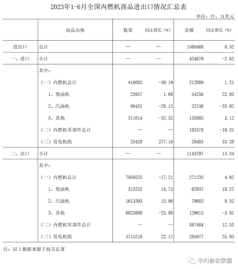 据海关总署数据整理,2023年1-6月内燃机行业进出口总额156.85亿美元,同比增长8.52%,其中,进口42.47亿美元,同比增长-2.62%,出口114.38亿美元,同比增长13.34%。
