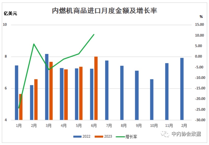 在进口金额中,汽油机、内燃机零部件下降幅度仍较大,其余各类同比均已正增长。具体为:2023年1-6月柴油机进口5.43亿美元,同比增长22.93%;汽油机进口2.27亿美元,同比增长-33.92%;其他类整机进口13.59亿美元,同比增长3.12%;内燃机零部件进口18.34亿美元,同比增长-10.31%;发电机组进口2.84亿美元,同比增长33.20%。