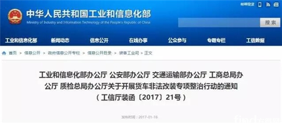 为贯彻落实《国务院办公厅关于实施公路安全生命防护工程的意见》(国办发〔2014〕55号)、2015年国务院安委会全体会议精神以及《交通运输部 工业和信息化部 公安部 工商总局 质检总局关于进一步做好货车非法改装和超限超载治理工作的意见》(交公路发〔2016〕124号),加大对货车非法改装行为的打击力度,着力从源头预防和遏制货车违法超限超载行为,工业和信息化部、公安部、交通运输部、工商总局、质检总局决定在全国范围内开展货车非法改装专项整治行动。现将有关事项通知如下: