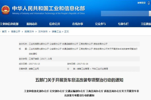 1月16日,工业和信息化部办公厅、公安部办公厅、交通运输部办公厅、工商总局办公厅、质检总局办公厅共五个部门联合发布了《关于开展货车非法改装专项整治行动的通知》,加大对货车非法改装行为的打击力度,着力从源头预防和遏制货车违法超限超载行为,以下为通知全文: