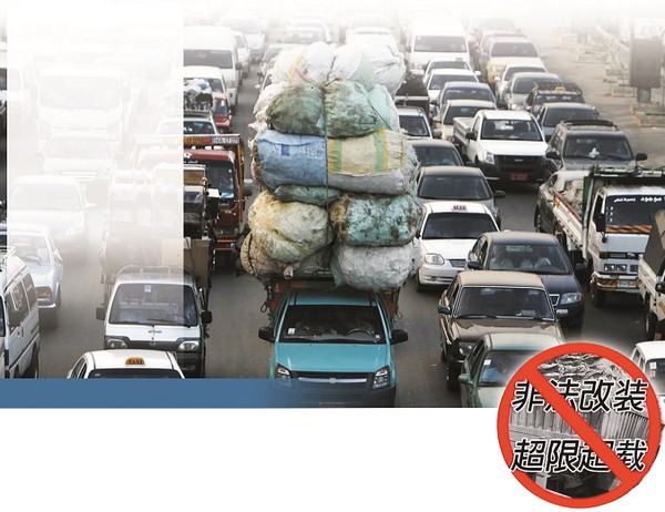 据介绍,路上跑的载货车几乎都进行加高改装,有的通过加厚钢板弹簧、扩宽厢体等方式增加载重量,使一辆车载重量增加四五倍。