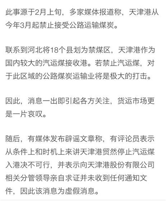 他进一步透露了今年的工作安排,其中第四方面“2017年将进一步加强交通行业的污染治理”中提到:“目前天津每年五千多万吨的煤炭采用重型柴油车公路运输的方式,同时铁路运输运能没有得到充分利用。计划今年9月底前,天津港不再接受公路运输煤炭,从而从源头上减少重型柴油车污染排放。”