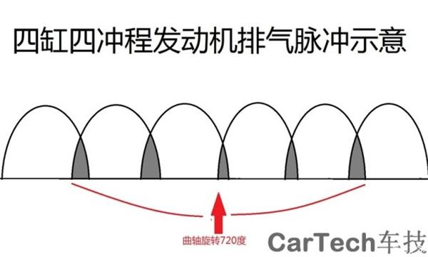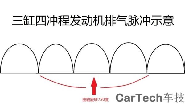 而三缸发动机则巧妙的躲过了排气干涉问题,前文中提到三缸发动机每180度会有一次爆燃和排气继续旋转60度才有第二次爆燃和排气,而通常排气门的提前打开和延迟关闭角加起来也正好是60多度(提前48度+延后20度),这样整个有排气效果的曲轴旋转过程就变成了180度+48度+20度,约248度,而一个奥拓循环是720度,这样排气干涉就变得很小可以忽略了,因此三缸发动机的排气脉冲正好是连续的,一个脉冲紧接着一个脉冲,如果这样的脉冲气流撞上了涡轮的叶片,显然会形成对涡轮的持续加速效果,这样涡轮迟滞问题就会比同排量的四缸发动机轻微一些。