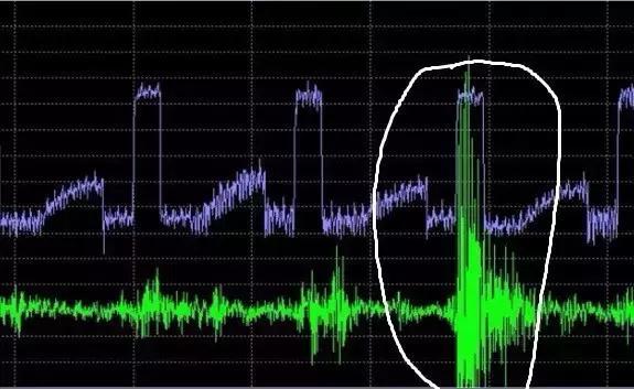 下图中的绿线是示波器中爆震传感器的原始信号,白圈处是明显的爆震。