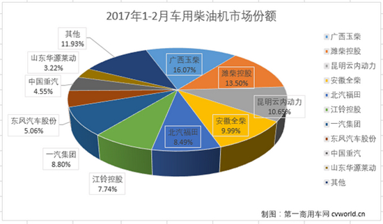 从累计销量来看,2017年1-2月的车用柴油机市场一片红火,销量前十企业均是高奏凯歌,增幅较高的玉柴、潍柴和重汽三家企业累计增幅均超过100%;增幅最低的安徽全柴,也增长了8.93%。